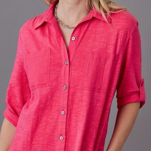 Easy and relaxed. our button front shirt dress is knit in a cozy fabric with woven front pockets. roll tab sleeves and smoke shell buttons. Shirttail hem. Cotton. Machine wash. Imported. Exclusive. Sizes XS (0-2). S (4-6). M (8-10). L (12-14). XL (16-18). XXL (20-22). Approx. 36l.