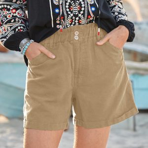 The most utilitarian shorts in your suitcase now updated for extra style. Paper-bag elastic waist. coconut buttons. zipper fly and rolled cuff hem. Cotton/linen. Machine wash. Imported. Exclusive. Sizes 2?C16. 5 inseam.