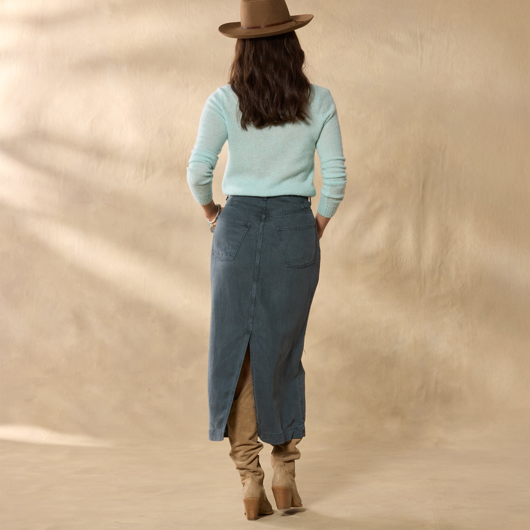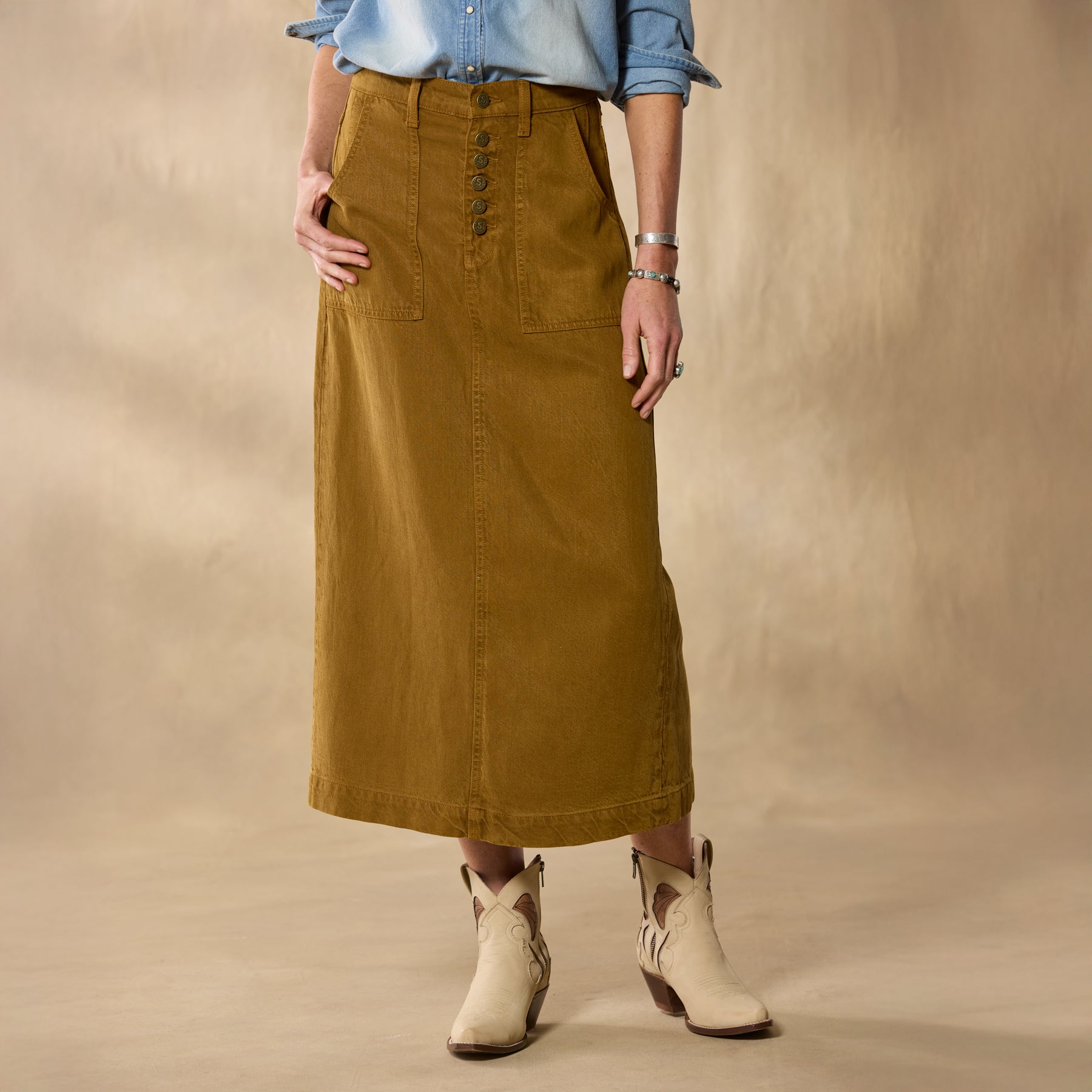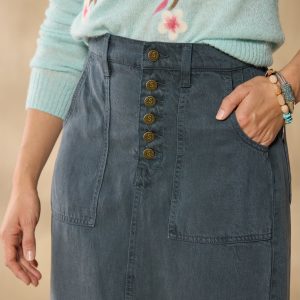 An instant everyday staple. our Bosque Skirt features an ultra-wearable midi length with a button fly. front patch pockets and a back slit. Tencel/linen/cotton. Machine wash. Imported. Exclusive. Sizes 24?C32. Approx. 30l.