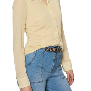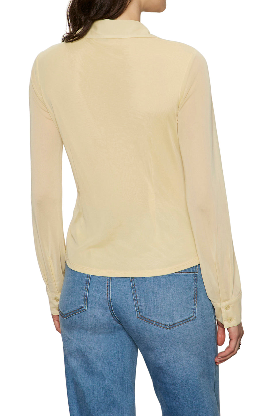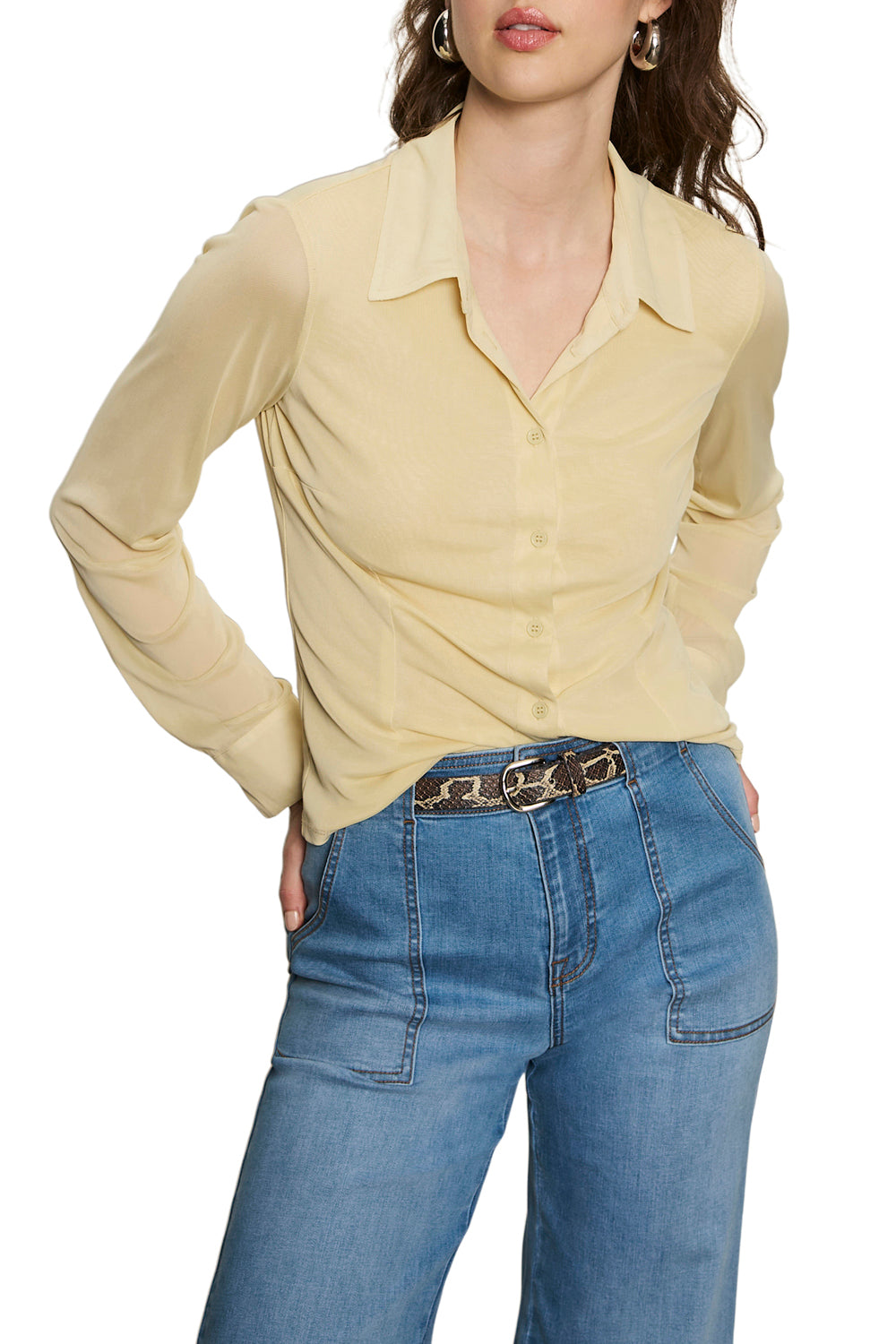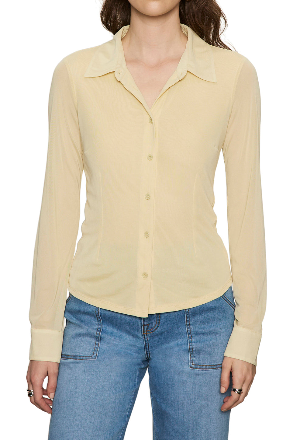 button down top made from a pale yellow mesh material. body of top is lined. while sleeves are sheer mesh. top features a button front. spread collar. long mesh sleeves. double button cuffs. and dart details on torso. giving top its fitted look. top makes a great transitional piece to wear into the spring.