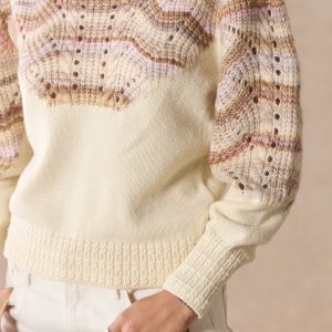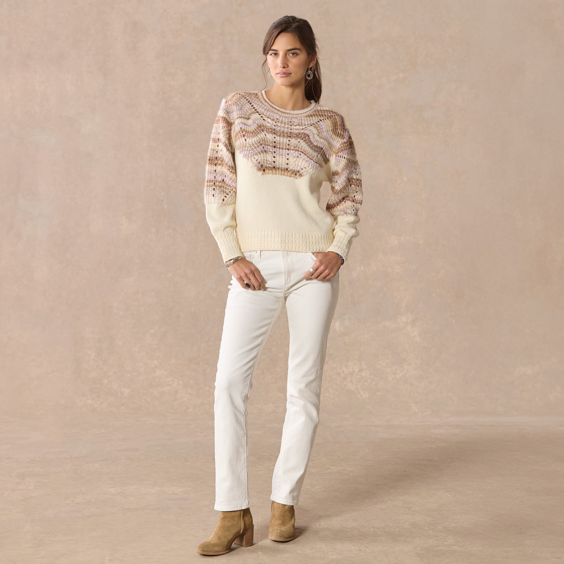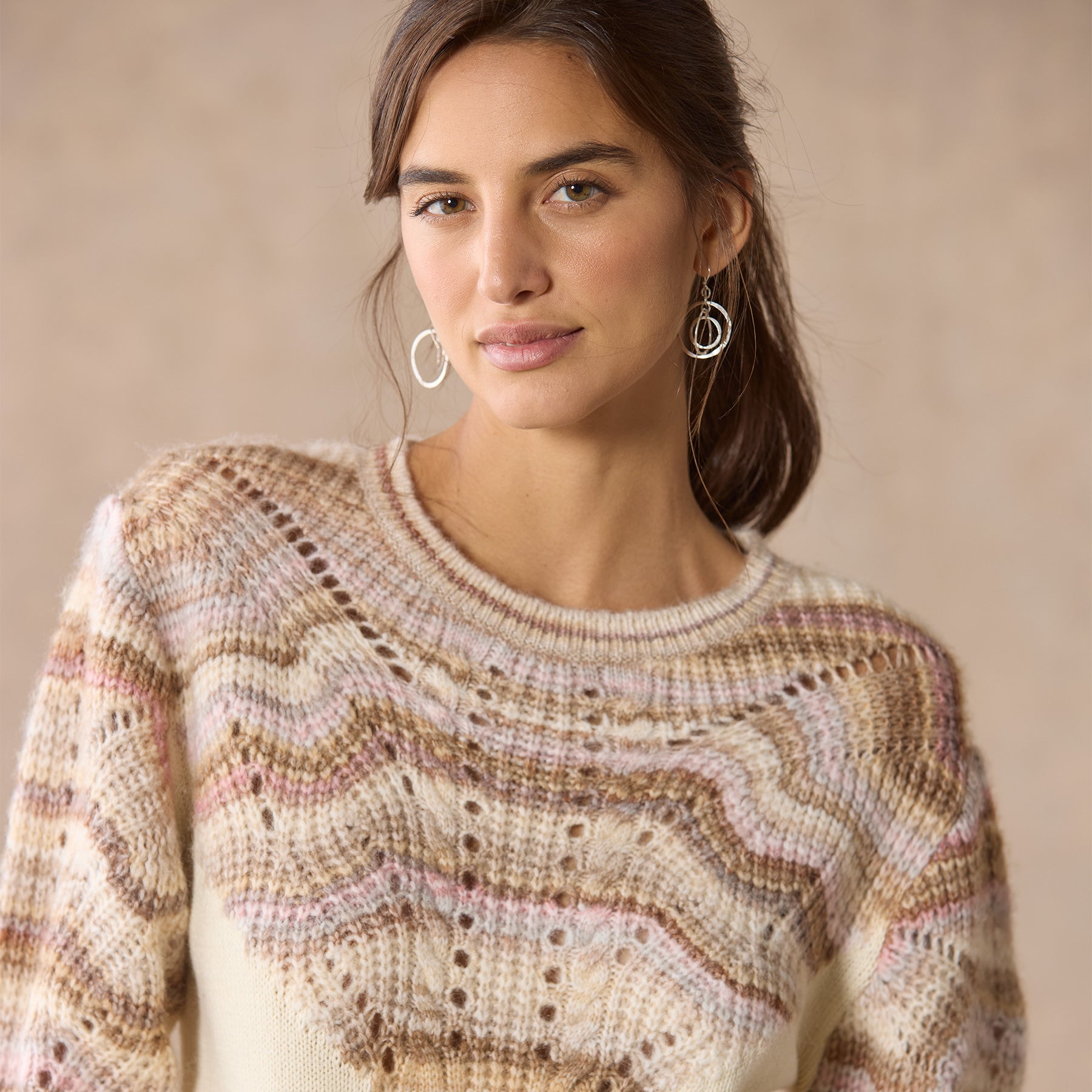 In cozy. lofty yarn. our crewneck sweater features a space-dyed intarsia yoke and sleeves. textural stitching with pointelle. cable stitch at cuffs and hem and feminine. volume sleeves. Cotton/polyester/acrylic/nylon/wool. Hand wash. Imported. Exclusive. Sizes XS (0–2). S (4–6). M (8–10). L (12–14). XL (16–18). XXL (20–22). Approx. 22.5l.