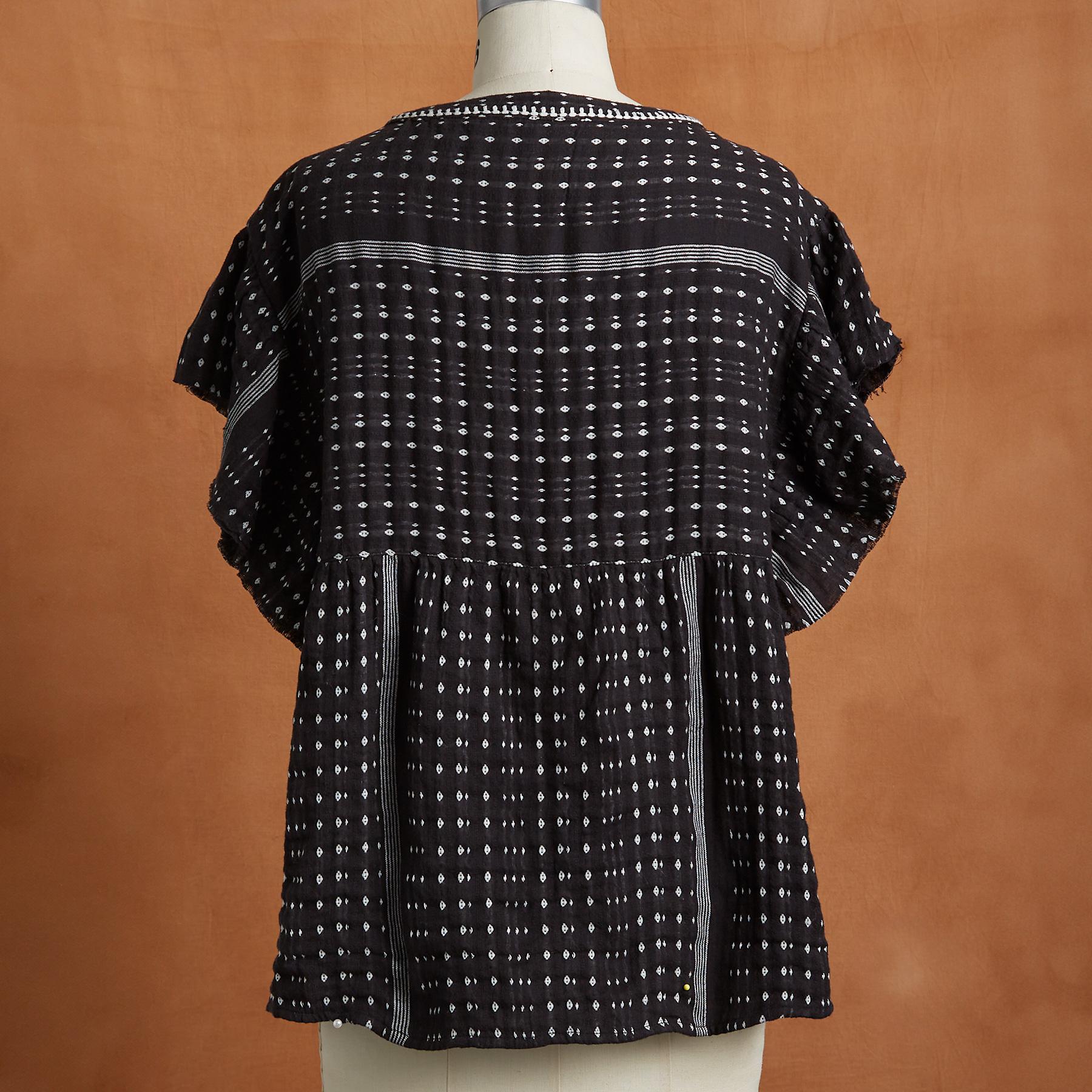 Easy and beautiful. our relaxed notch neckline top is so lovely with contrast embroidery detail on the bodice and feminine flounce with raw edge detail at the sleeves. Textured double gauze. Cotton. Machine wash. Imported. Exclusive. Sizes XS (0??). S (4??). M (8??0). L (12??4). XL (16??8). XXL (20??2). Approx. 25.5l.