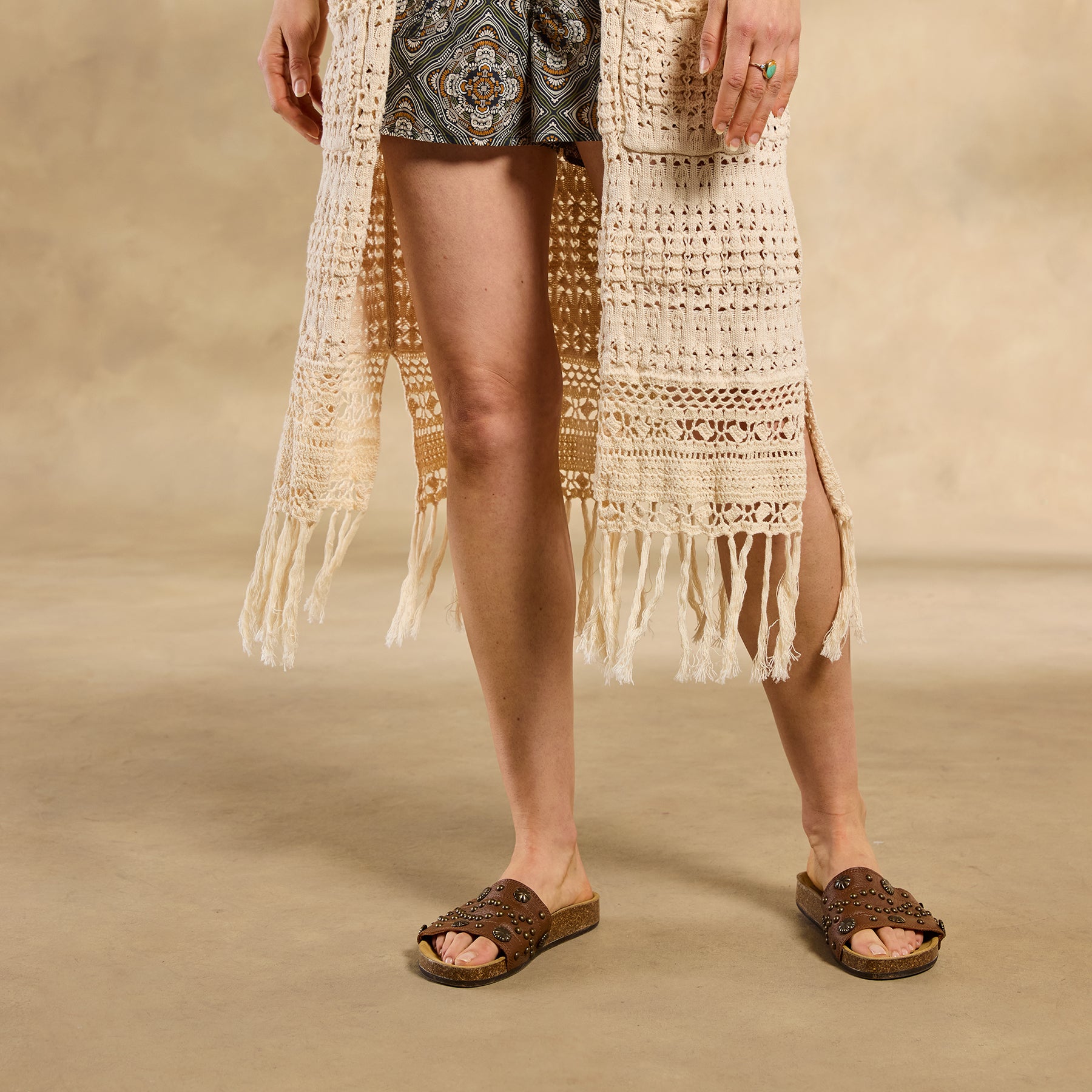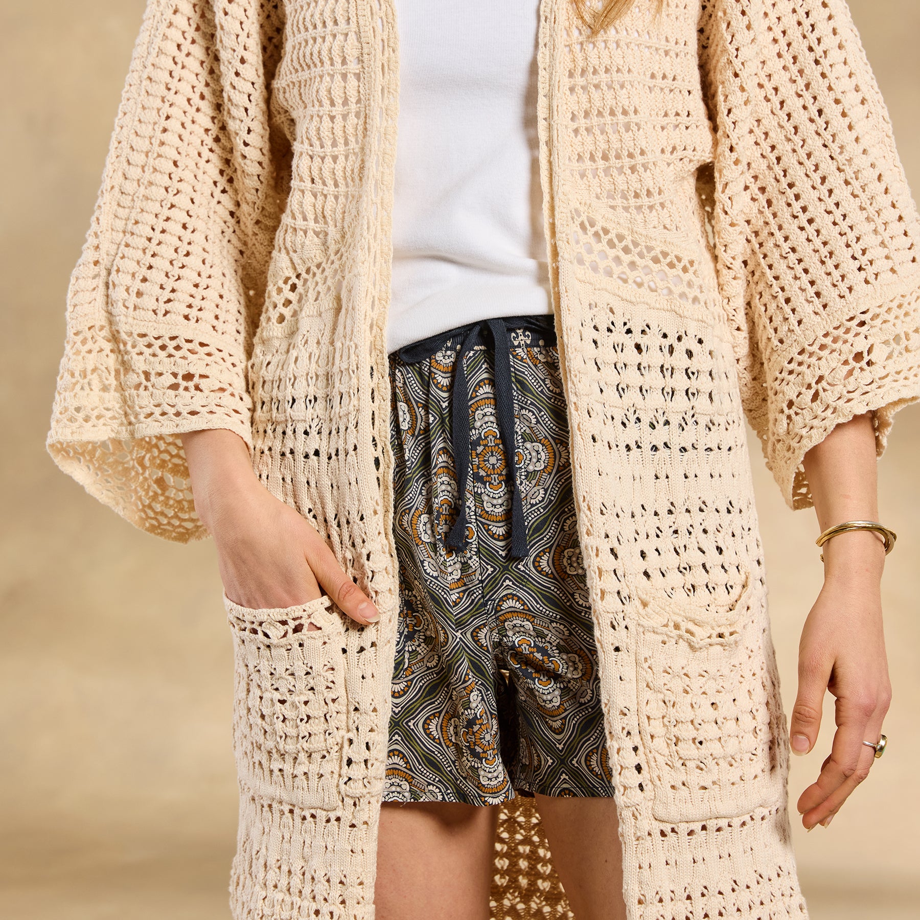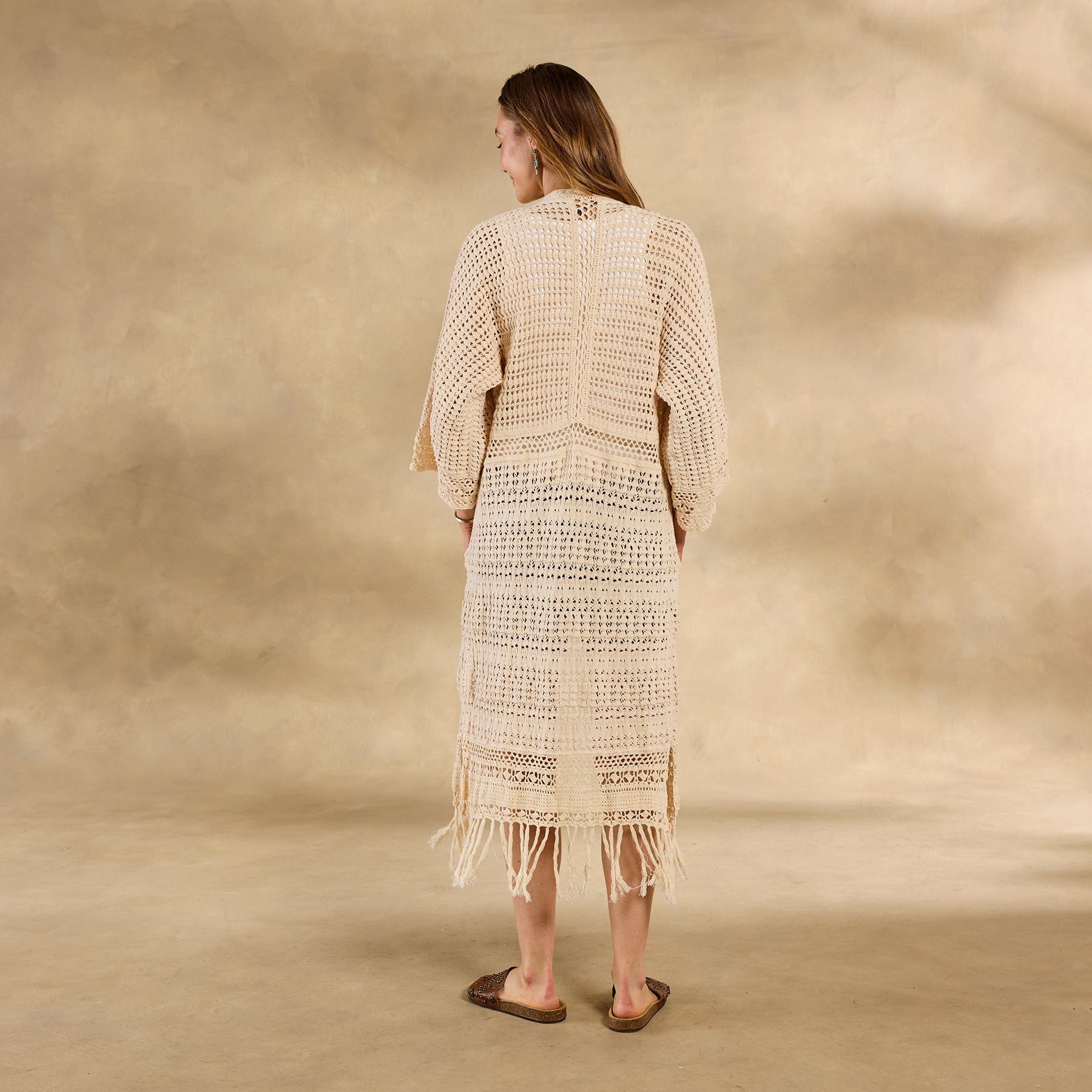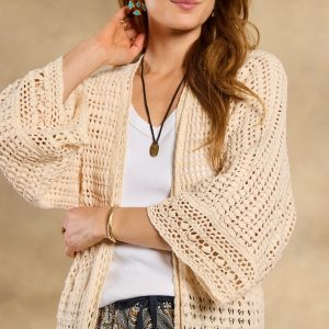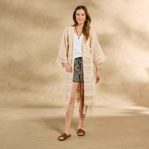 The ultimate neutral statement layer. our Island Sands Duster is absolutely brimming with special details??from mixed-stitch construction and hand-crocheted details to flirty fringe. Open front; patch pockets. Cotton. Hand wash. Imported. Exclusive. Sizes XS/S (0?C6). M/L (8?C14). XL/XXL (16?C22). Approx. 42l.