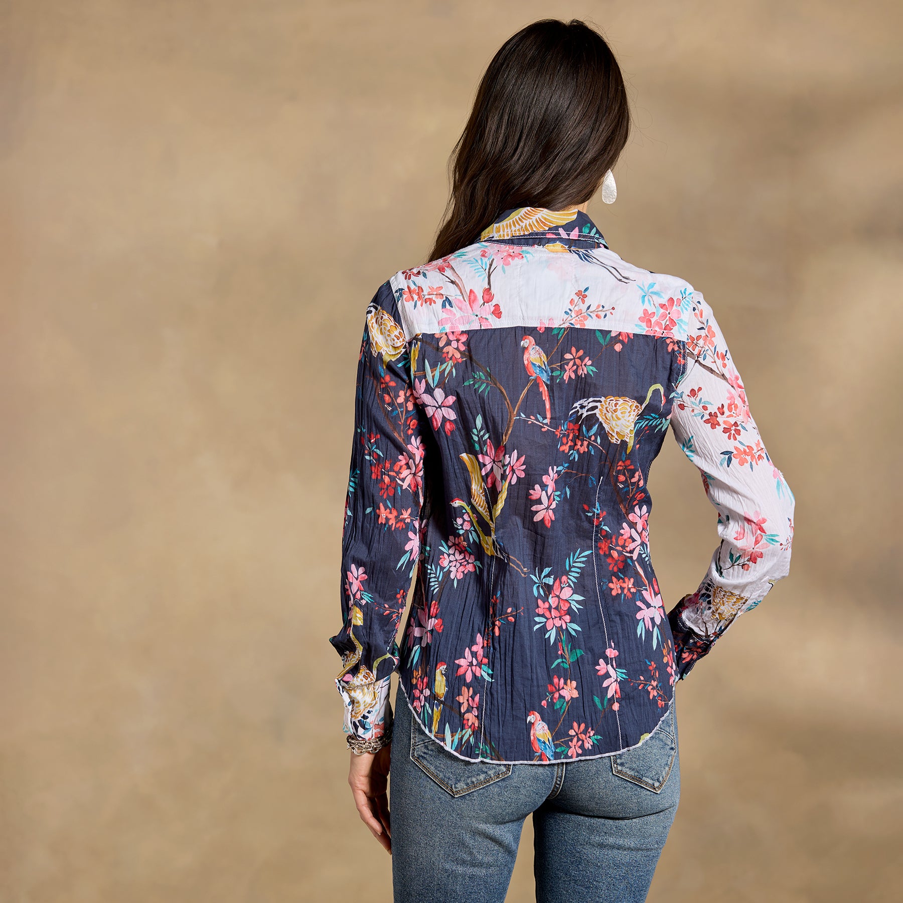 The beautiful gardens of Kyoto. Japan inspired the contrast prints on this light and airy crinkle cotton button-front shirt. Machine wash. Imported. Sundance exclusive. Sizes XXS (00). XS (0?C2). S (4?C6). M (8?C10). L (12?C14). XL (16?C18). Approx. 25.88l.