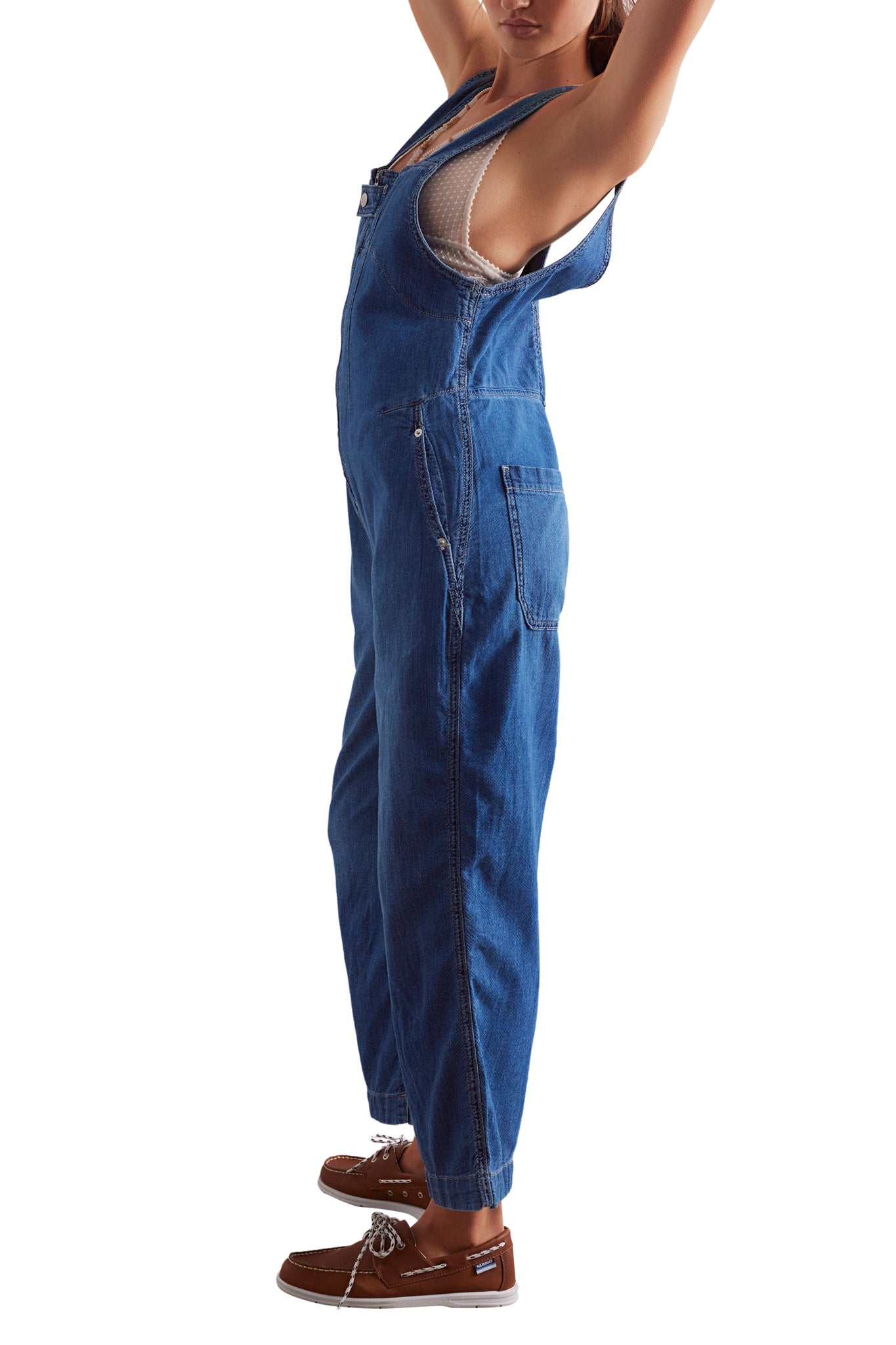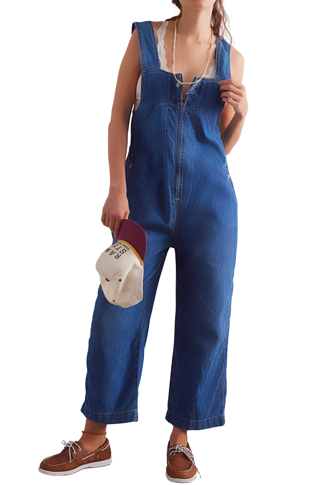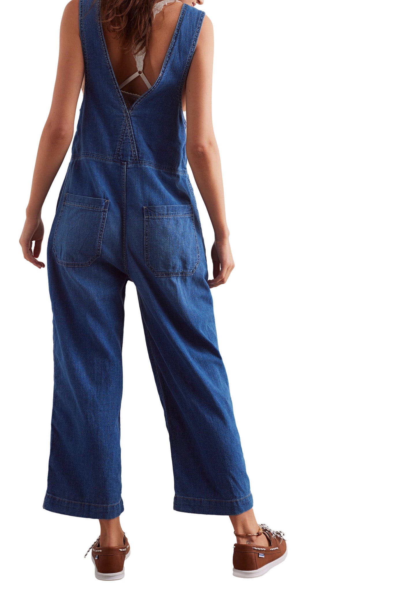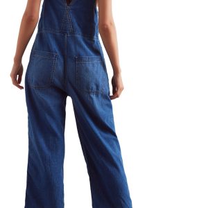 free people one and done jumpsuit in a medium indigo wash. one piece jumpsuit is made from a rigid. yet soft denim and has a relaxed. pinafore-inspired fit. it features a front zipper with offset button closure. square neckline. four-pocket design. and a wide leg silhouette. jumpsuit is slightly oversized and looser in the waist/hips. easy to wear piece is versatile and can be worn from season to season. pair with a sweater or long sleeve tee in cooler weather and with a tank or tee in warmer weather.