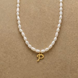 A letter-perfect example of everyday elegance. this string of freshwater pearls can be customized with a script alphabet charm. Charm and lobster clasp made of 14kt gold-plated stainless steel. Handcrafted with silk cord. USA. 15??6 1/2l.