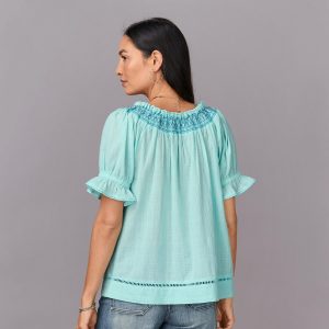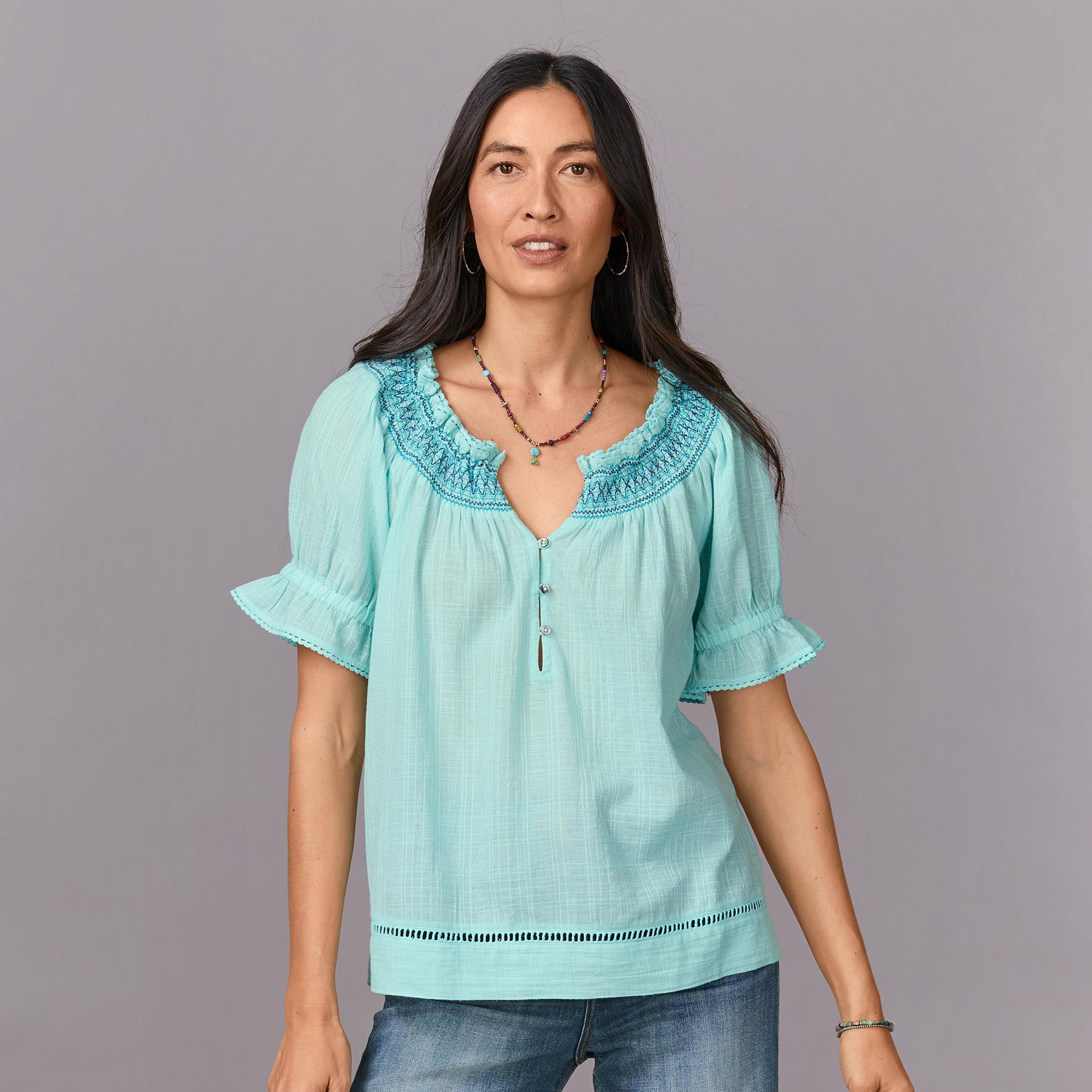 Feminine and full of surprising texture. our relaxed pullover top with contrast smocking. ruffles and scalloped neckline flows with pretty lace details. Button placket with loops. elastic cuffs. Cotton. Machine wash. Imported. Exclusive. Sizes XS (0-2). S (4-6). M (8-10). L (12-14). XL (16-18). XXL (20-22). Approx. 24.5l.