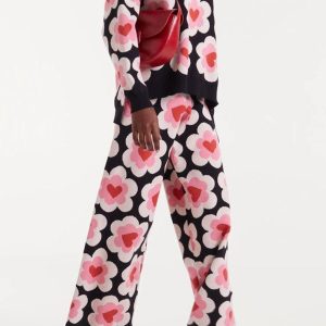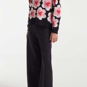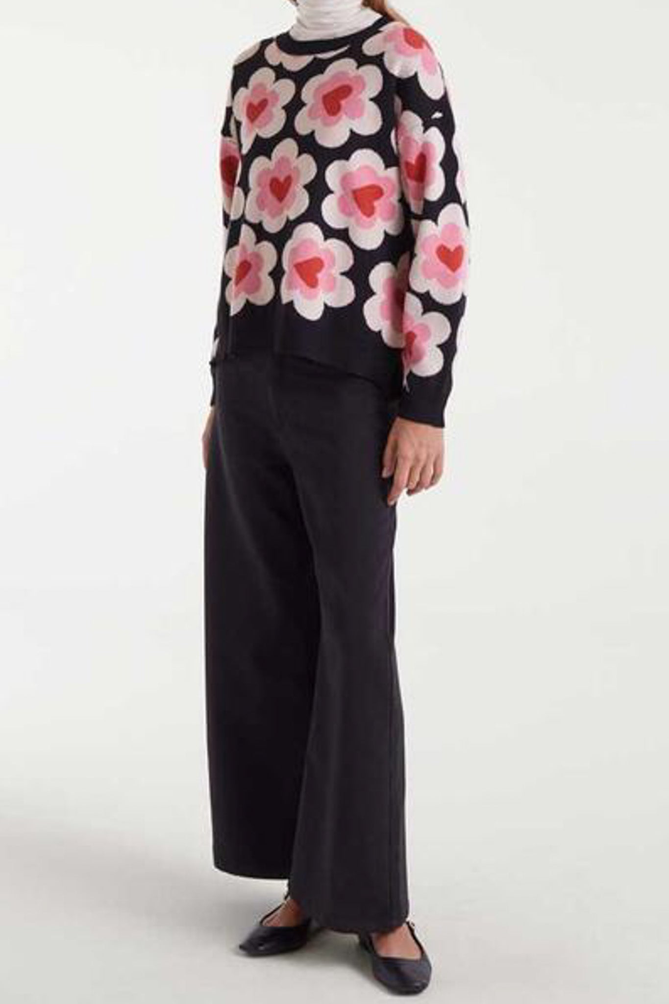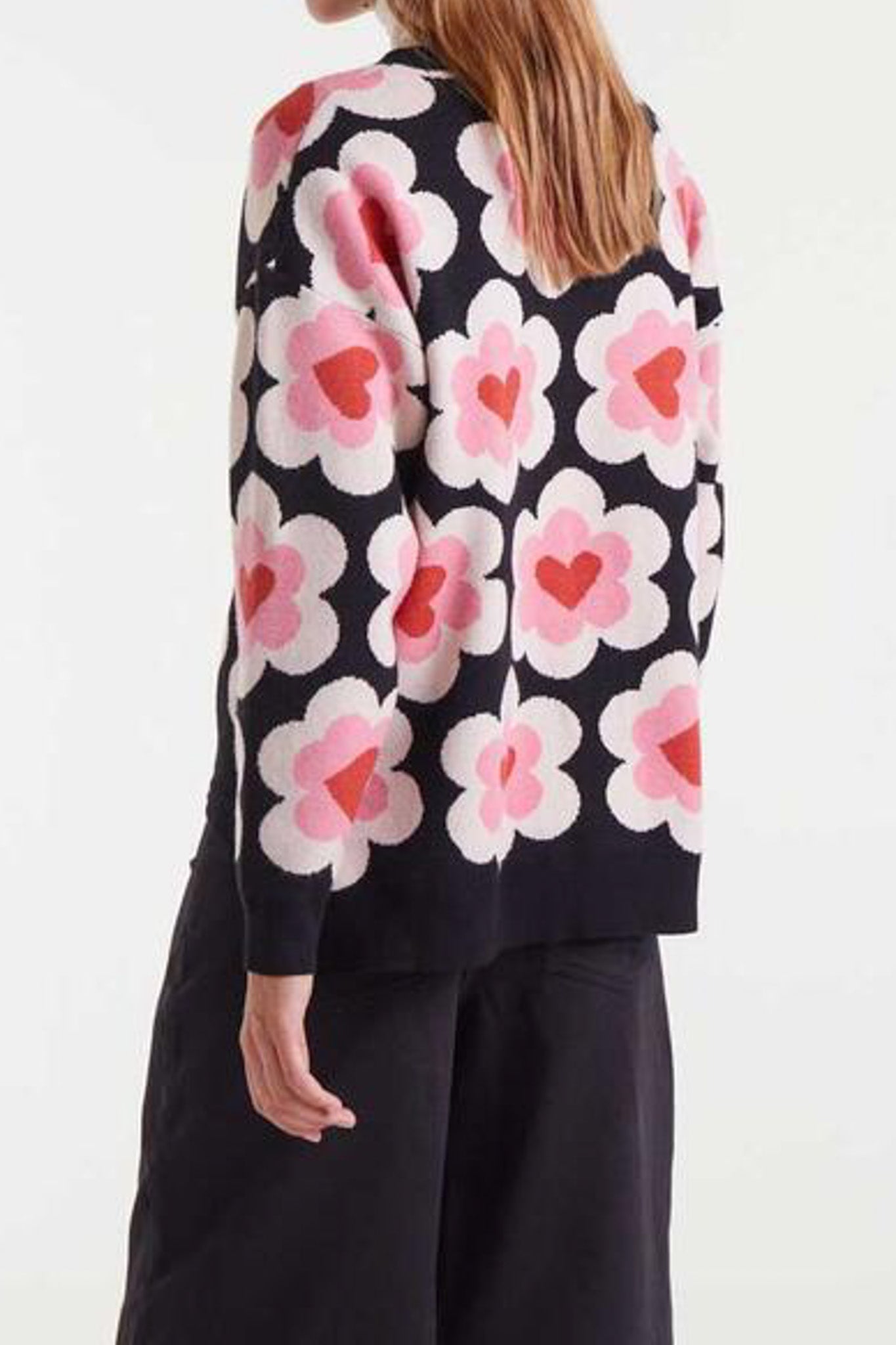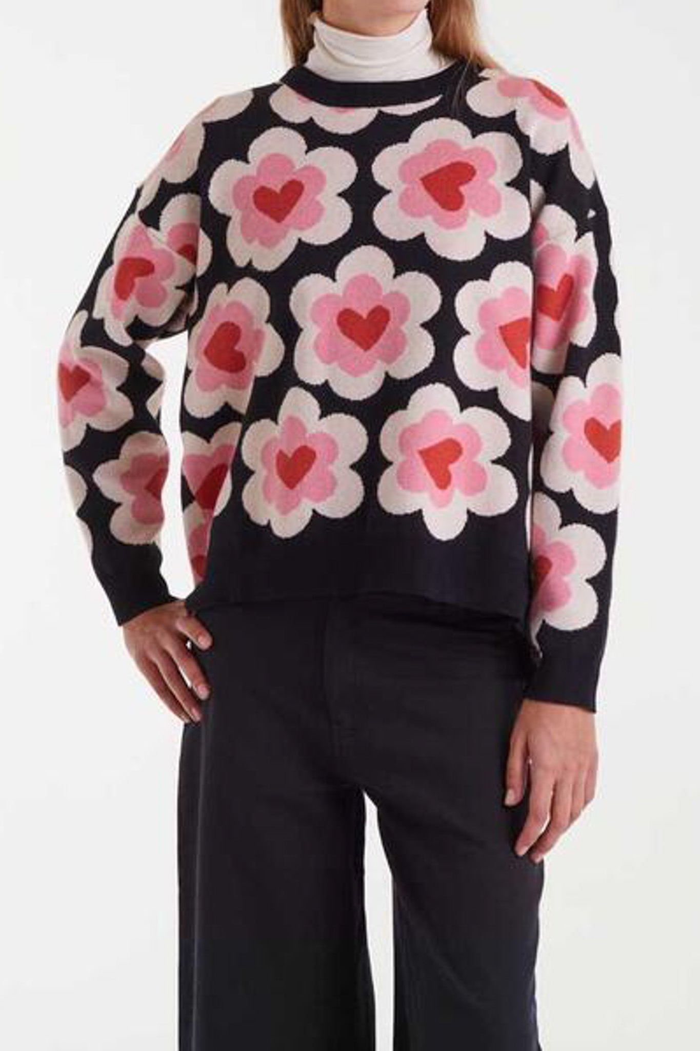 knit sweater in navy blue with a sweet floral design in pink. red. and white. soft and stretchy sweater features a crew neckline. dropped shoulders. roomy long sleeves. ribbed details on cuff and bottom hem. and a slightly oversized fit. sweater can be paired with the pink petal knit pants for the cute. coordinated look pictured last or can be worn with your favorite jeans or trousers to suit your own unique style.