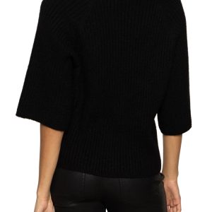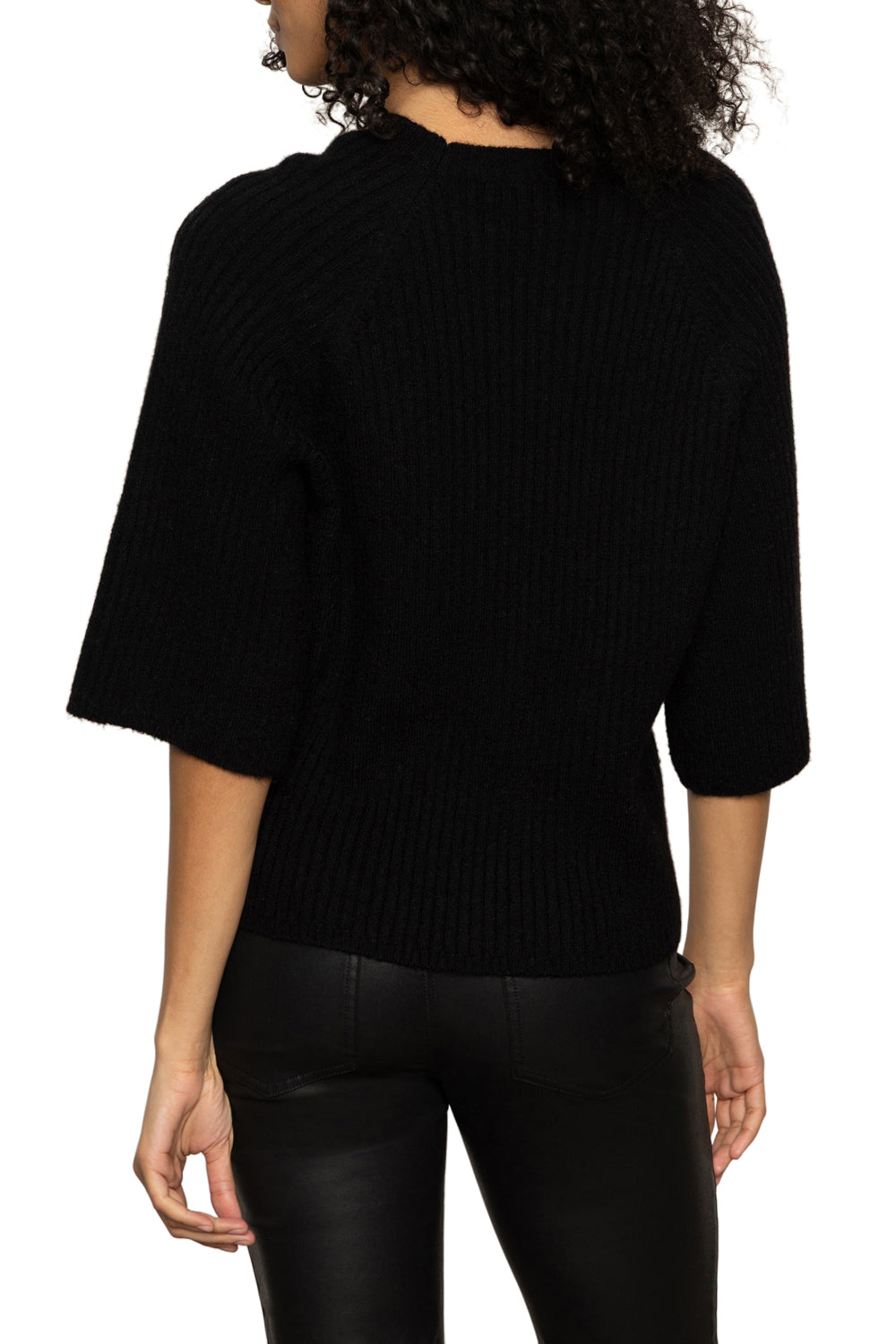 beautifully made ribbed knit sweater tee in classic black. pull on top features a crew neckline. roomy half sleeves. and a relaxed fit. top is soft. comfortable. and looks great with a variety of bottoms.