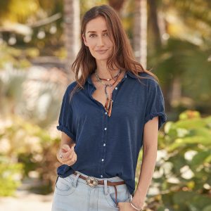 Reverse printed for a casual. faded look. our relaxed-fit sweater boasts an alluring V-neck front and back. exposed seaming details. rib trim and side slits. Subtle hi-lo hem. Cotton. Hand wash. expect dye transfer or loss. Imported. Exclusive. Sizes XS (0–2). S (4–6). M (8–10). L (12–14). XL (16–18). XXL (20–22). Front approx. 23l.