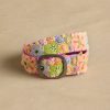 This cheerful wool belt features richly embroidered blooms on a black background. Five sets of holes so the belt can be worn at the hips or the waist. Handcrafted in Peru. Metal buckle. Exclusive. Sizes S (32). M (34). L (36). Approx. 1.8 wide.