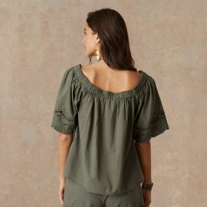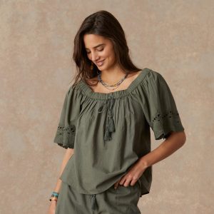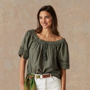 This relaxed. flowy blouse can be worn on or off the shoulder and features a smocked neckline with tasseled tie. cut-out details and embroidery. Cotton. Machine wash. Imported. Sizes XS (0-2). S (4-6). M (8-10). L (12-14). XL (16-18). XXL (20-22). Approx. 24.5l.